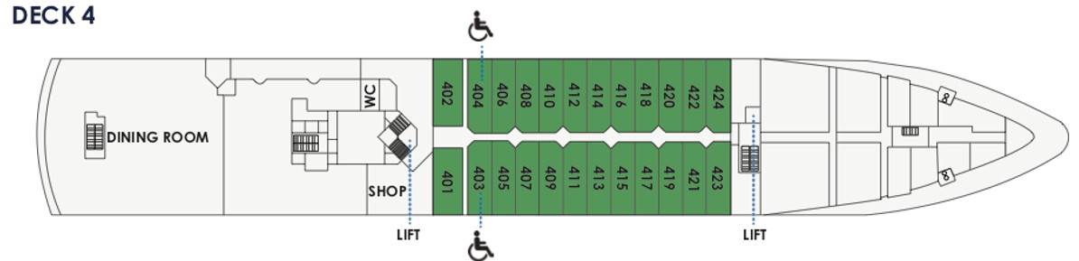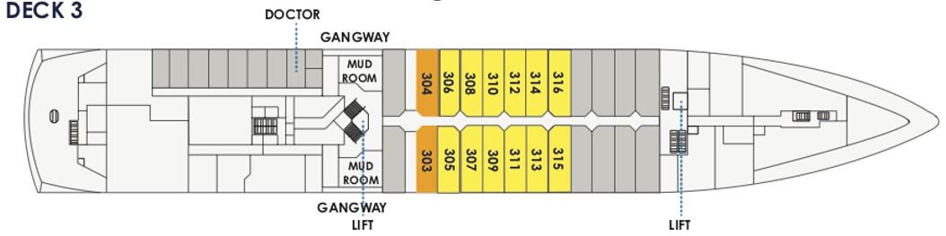 | Cabin Category | Main Deck Triple | Superior Triple | Deck 4 Superior | Deck 5 Superior | Worsley Suite | Heritage Suite | Main Deck Single | Superior Single |