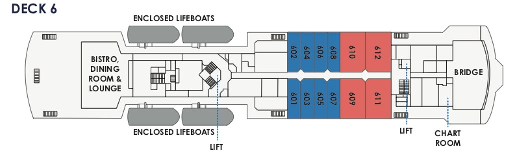 - Bistro: offering simple meals and snacks on the aft of deck 6. Enjoy great views while sipping on a coffee and quick access to a covered outdoor deck space.