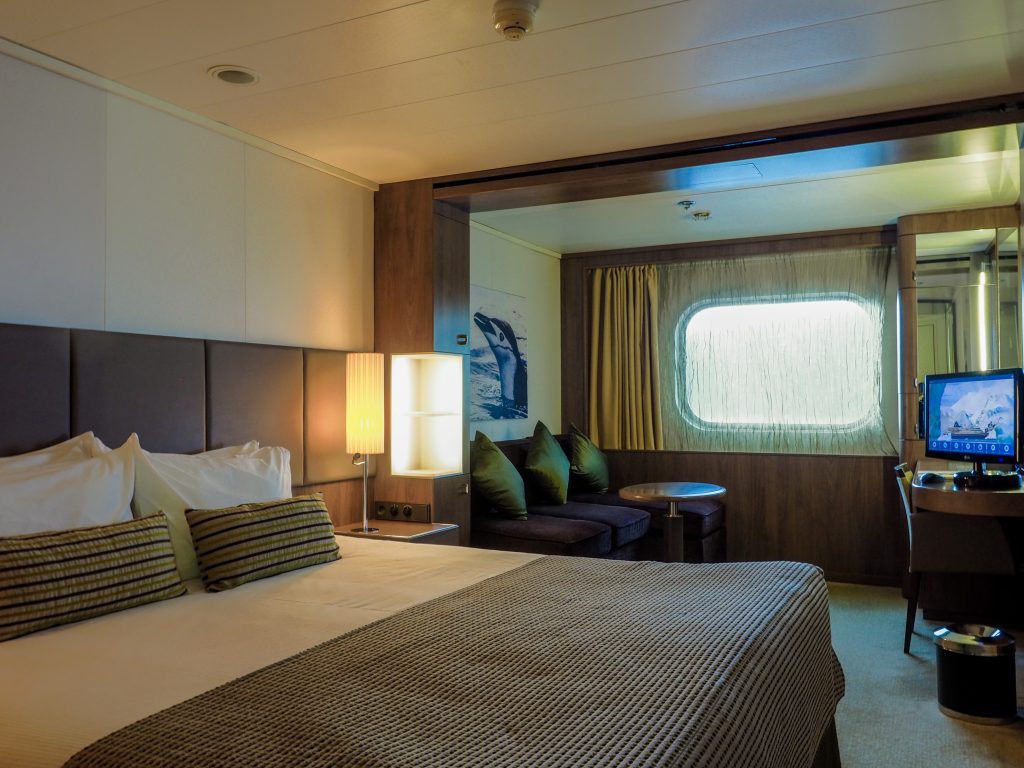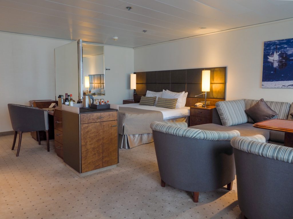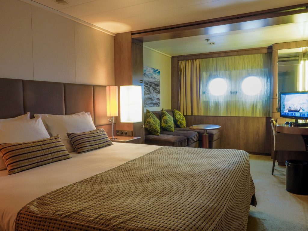 The four Heritage Suites are the most spacious cabins onboard the Heritage Adventurer. Featuring large double panoramic windows, living area with sofa, coffee table & chairs, large desk, floor to ceiling cabinetry for storage, flat screen entertainment system and grand marble bathroom with a double basin, bathtub and shower. Receive complimentary in-room dining, minibar replenished daily, free laundry and a US$100.00 per person SPA credit.