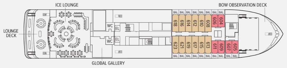 The singular Category 6 cabin is a junior suite with balcony, pull-out sofa, writing desk with chair, two bedside tables, coffee table, espresso maker, closet and private bathroom. Guests receive complimentary laundry and priority access to one igloo reservation and one spa appointment per departure.