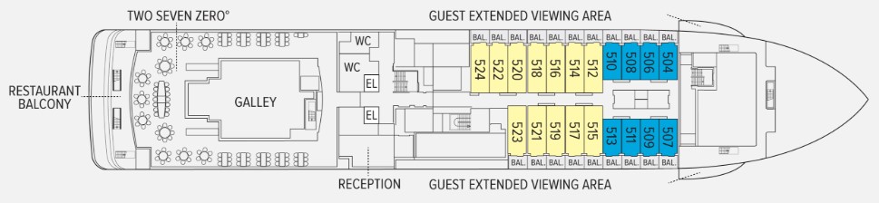 - Two restaurants, featuring local, sustainable choices and unassigned seating for flexible, inclusive dining plus a Chef’s table for intimate, small group dining. Main restaurant has 270º views, and the Observation deck restaurant features lighter, made-to-order fare.