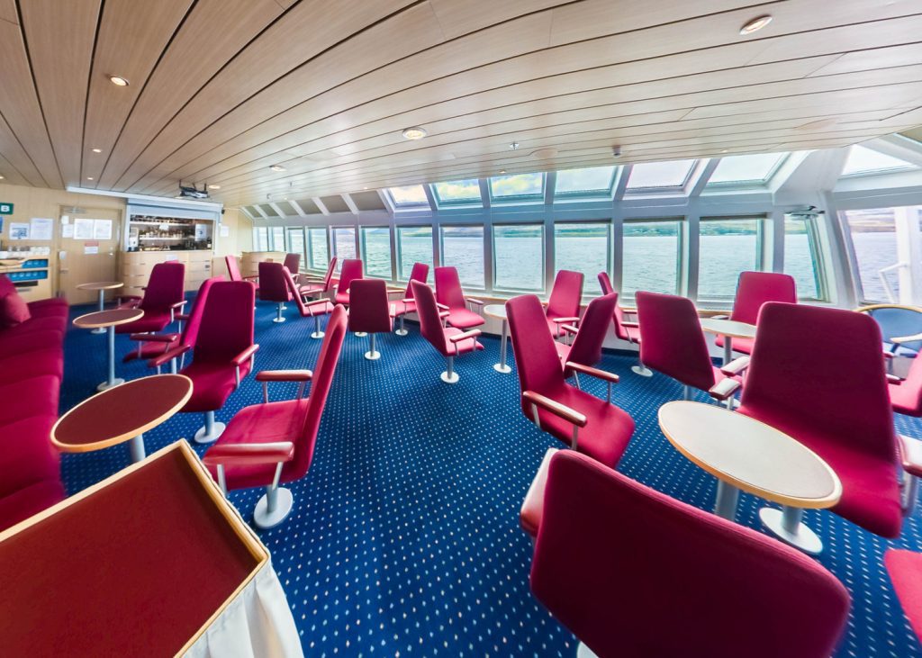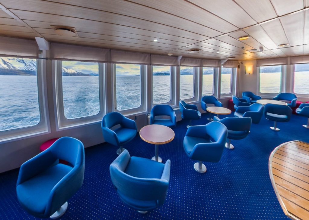 Enjoy the views from the top deck observation lounge or from the forward, side or aft outdoor deck spaces.