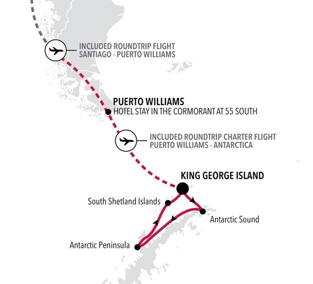 - Roundtrip charter flights Puerto Williams – King George Island on ‘Day 1’ & ‘Day 7’