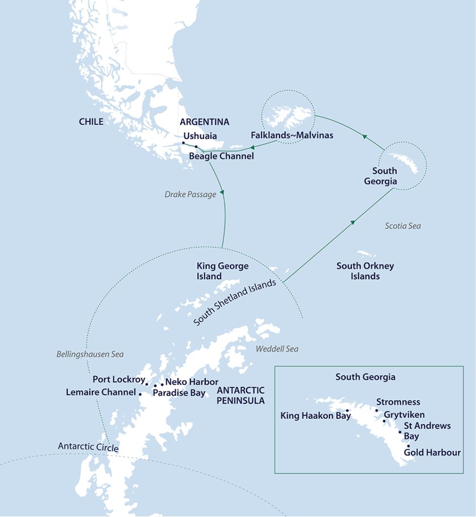 • 6 days in Antarctica, 4 days South Georgia & 1 day in the Falklands (actual itinerary may vary)