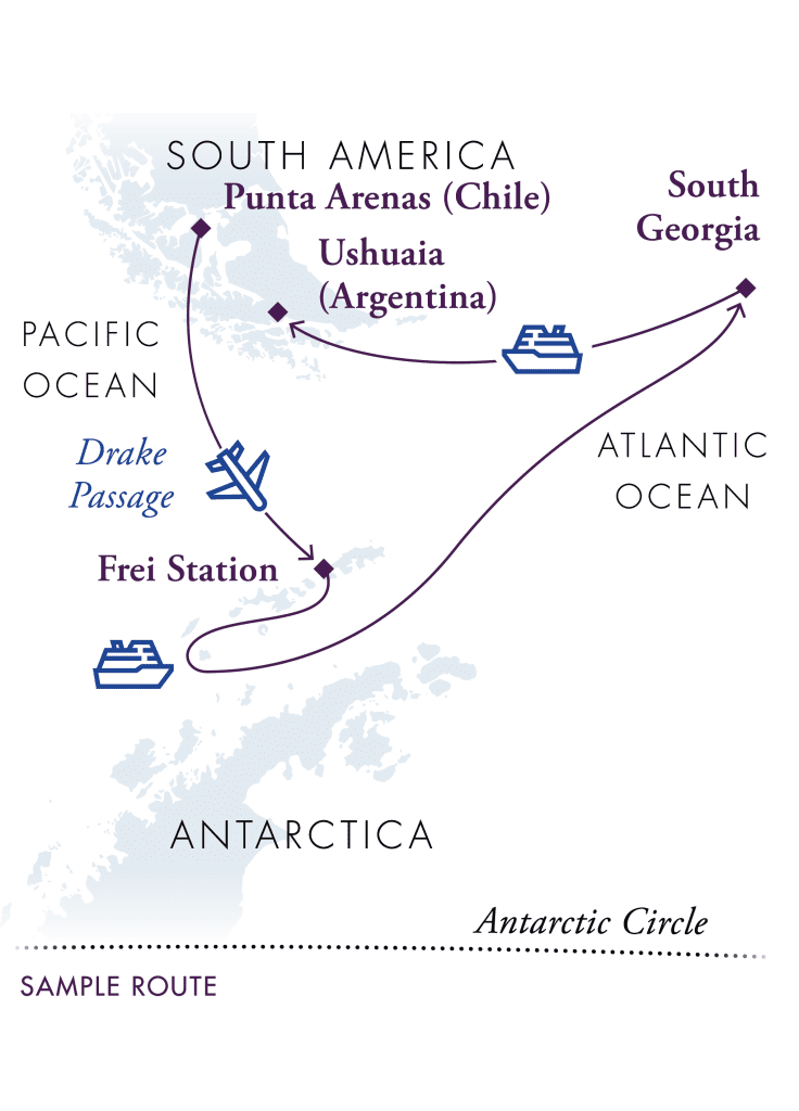 Please note the itinerary and route map are only tentative outlines of what you may experience. No specific itinerary, routing or landing sites can be guaranteed in advance. Where the ship actually sails will depend on a lot of factors including, but not limited to, the weather & ice conditions and the captain & expedition leader. Every trip is different, which adds to the excitement of expedition cruising in the polar regions. Trips with flights to and/or from Antarctica have a higher risk of having a trip delay or interruption due to weather.