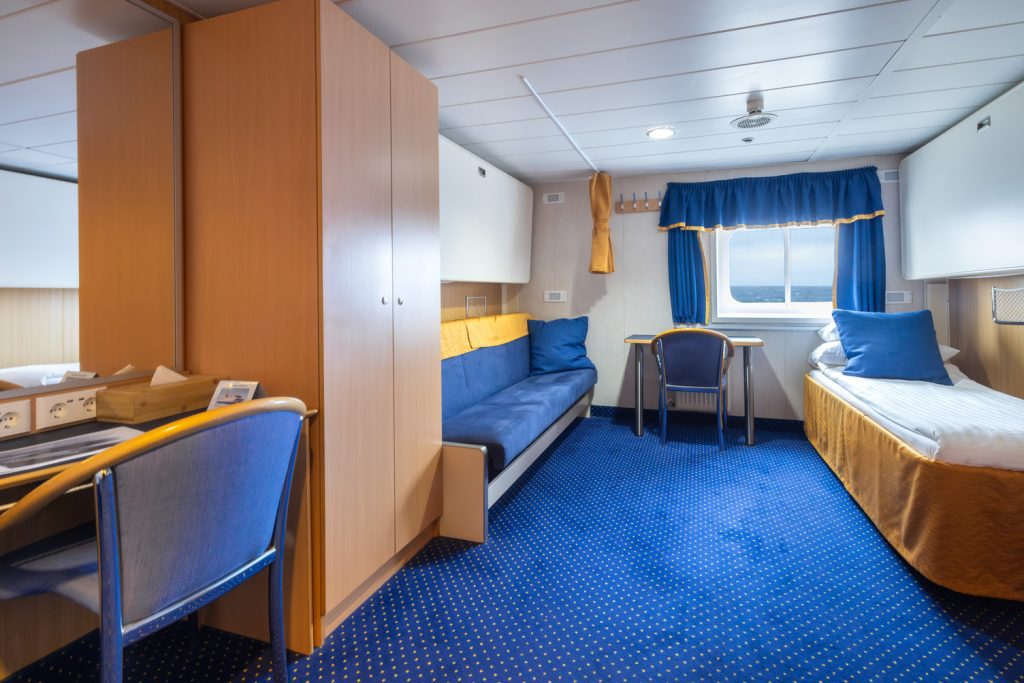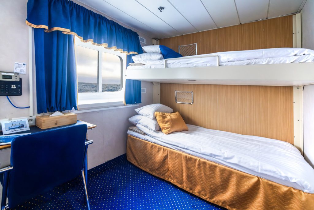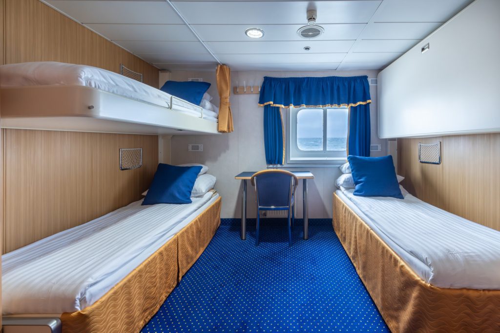 The lone Triple Cabin features two lower berths and one upper berth, a picture window, a writing desk with a chair, two wardrobes and a private bathroom with a shower.
