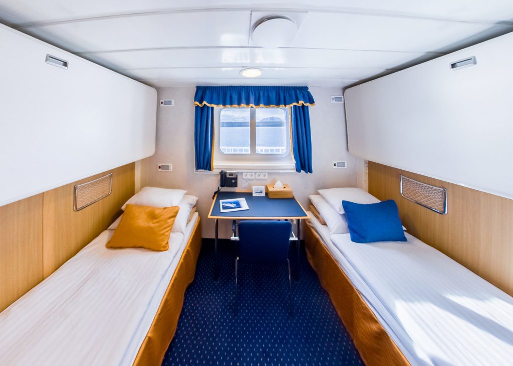 Featuring two twin beds or one queen bed (most have two twins), a picture window, a writing desk with a chair, a wardrobe, and a private bathroom with a shower. Note – in the cabins that do have one queen bed, the bed is pushed up against one of the walls.