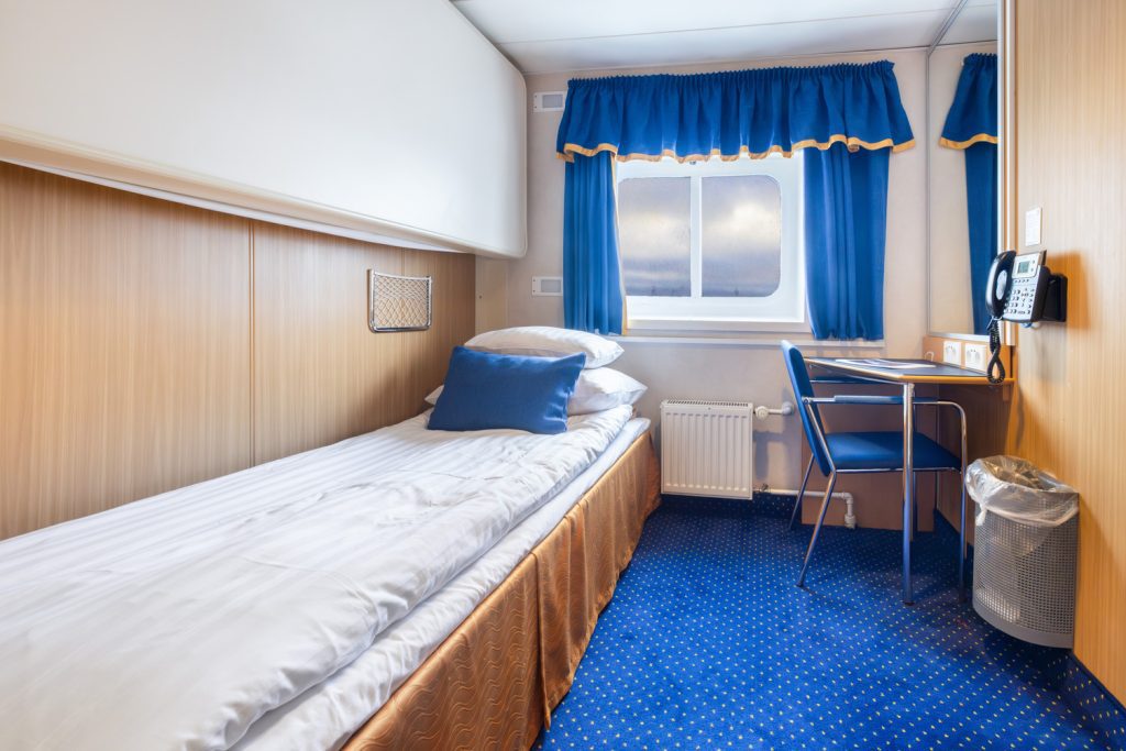 Single cabins have one lower single bed, a picture window, a writing desk with a chair, a wardrobe and a private bathroom with a shower. There are only two Single Cabins on the ship.