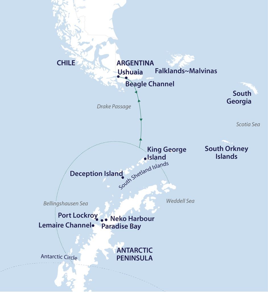 Note: At the conclusion of the voyage, we do not recommend booking flights departing Ushuaia prior to 12:00 pm on the day of disembarkation in case there are delays.