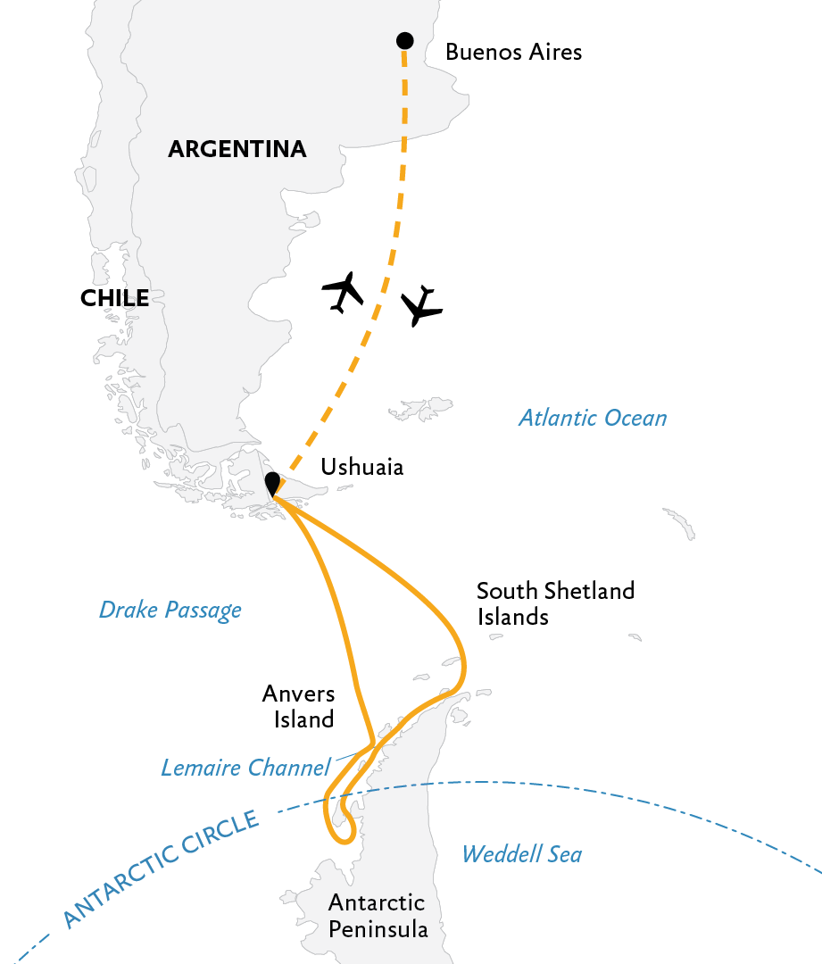 Not only will you reach the Antarctic Circle, but you’ll also explore the southern heart of the Antarctic Peninsula. And you’ll experience it all from sea—and air. Get ready to embrace the pinnacle of polar adventures.