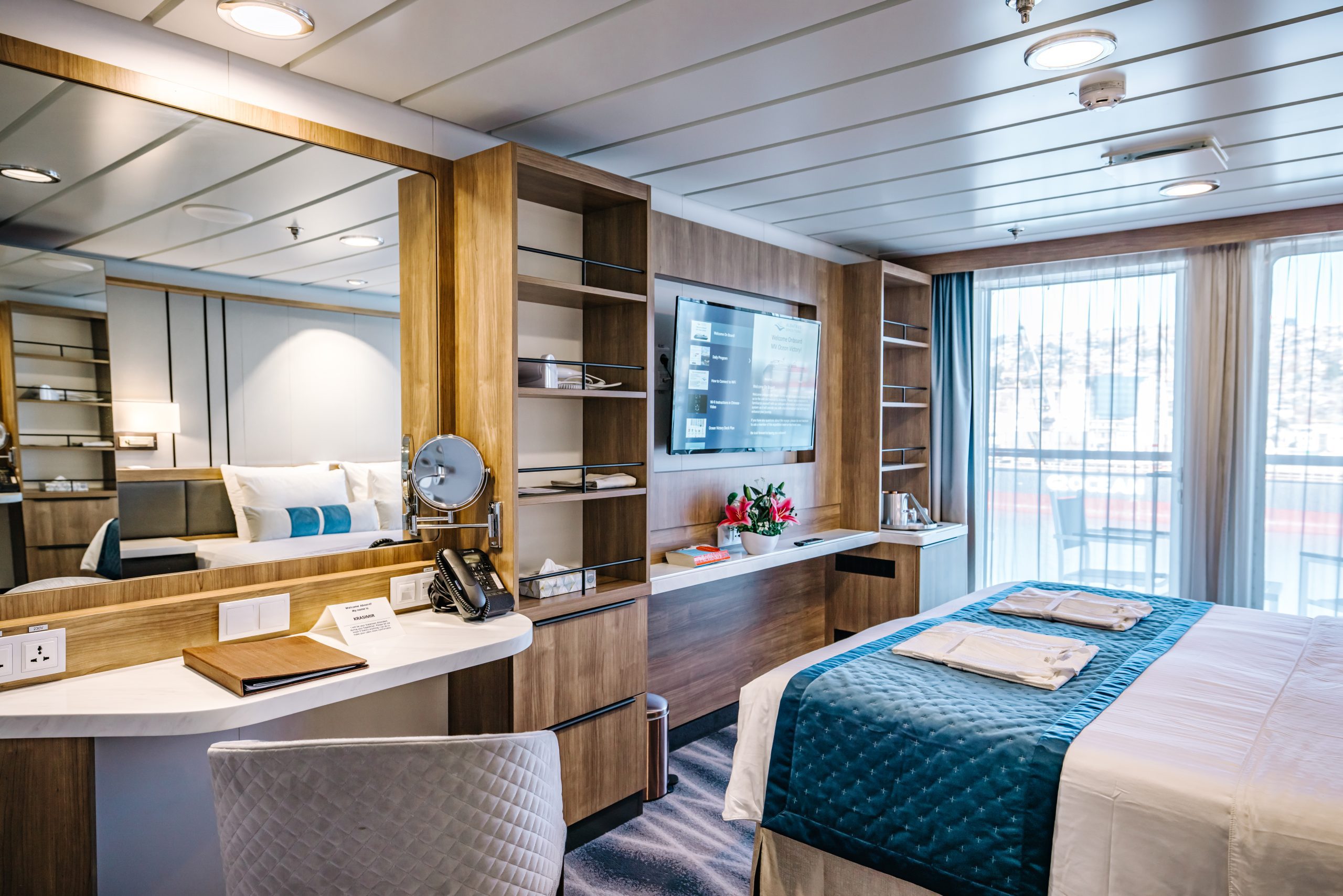 Ocean Victory has 2 Balcony Suites on board located mid-ship on deck 6. The suites feature double or twin beds, desk and chair, bathroom, and a large balcony.
