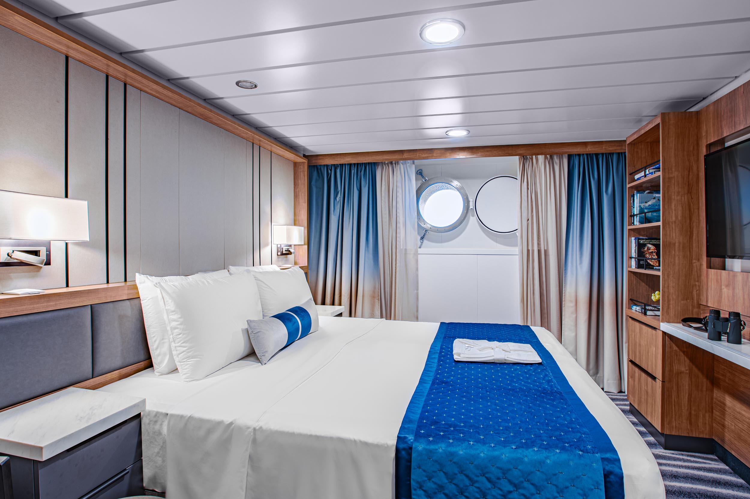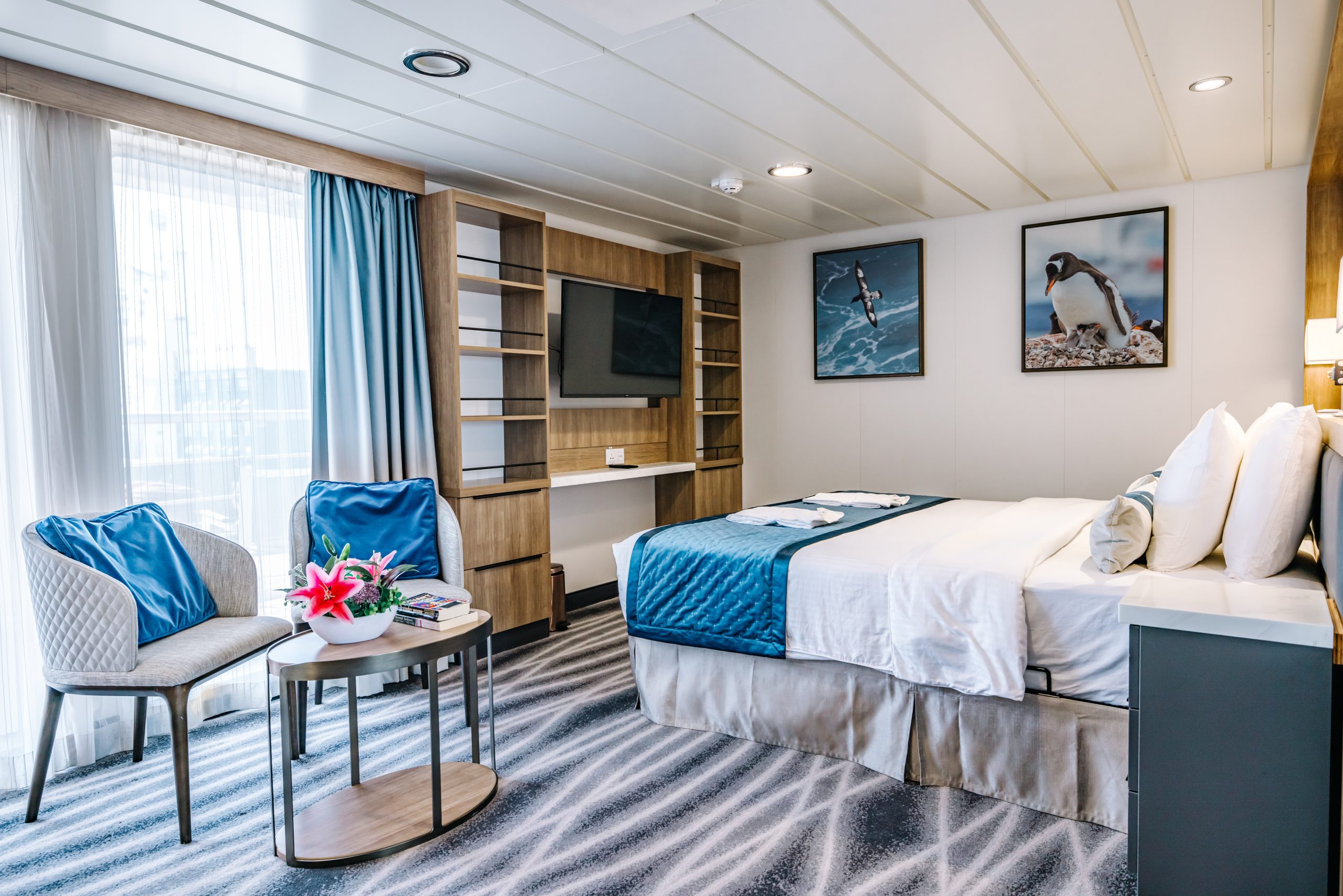 The 4 junior suites have a great view from their location high up on the ship. The suites feature a double bed or twin beds, sitting area with sofa bed, a spacious bathroom and a private balcony. The suite can accommodate up to 3 people.