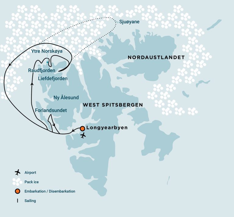 This voyage will take you into the pack ice and along the remote shorelines of rugged north Spitsbergen. Places we might visit include the following: