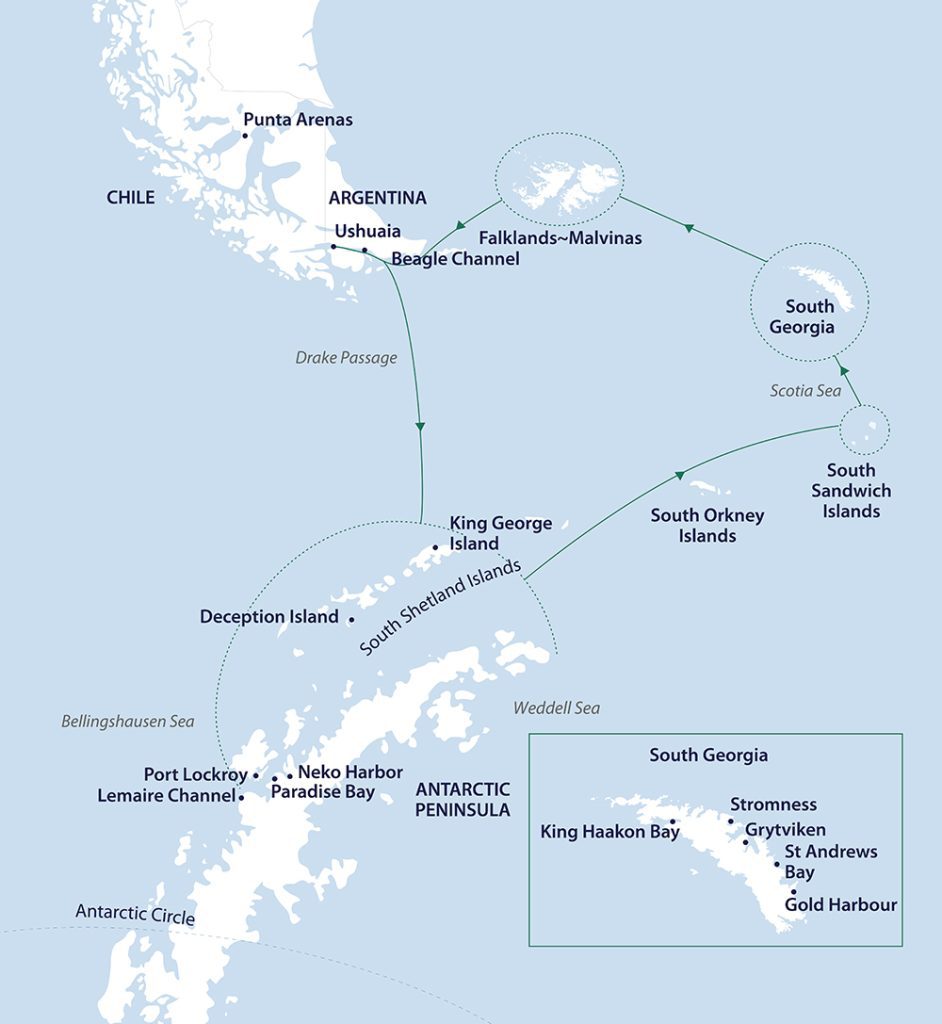- 4 days Antarctica, 2 days South Sandwich Islands, 4 days South Georgia & 1 day Falklands (actual itinerary may vary)