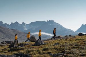 The deep fjord of Tasermiut is striking in its stark natural beauty. Steep mountains rise abruptly from the sea. Sharp peaks and ridgelines dominate the skyline, while the valley floors and lower slopes support a surprisingly diverse mix of vegetation—grasses, wildflowers, lichens and hardy dwarf trees. Signs of glacial retreat are clearly visible: once ice-filled valleys now channel milky blue rivers that fan out into small deltas and tidal f lats as they meet the fjord. The intention here is to explore by foot, with hiking routes suitable for guests with a range of interests and abilities. Some may choose a faster-paced trek to reach deeper into the wilderness, while others may take their time, pausing to admire the incredible landscape. As in previous outings, the ground will be uneven— rocky in places, with patches of moss and low vegetation. Our route will depend on conditions, but possible destinations include Klosterdalen and Qoorormiut Kangilliit—both known for their dramatic mountain backdrops.