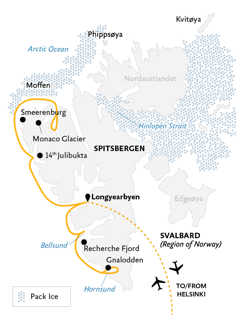 Transfer Package includes a Helsinki airport hotel on Day 1 & 10, roundtrip charter flights between Helsinki & Longyearbyen and roundtrip Longyearbyen airport transfers.