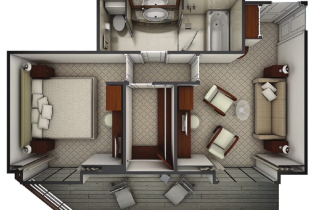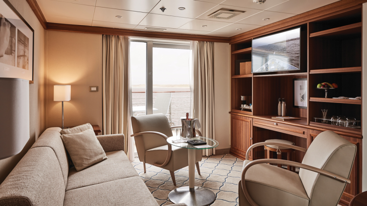 Grand Suites are forward on Deck 7 and offer generous living space with a warm, inviting design. They feature a separate living area with a sofa bed, private balcony with outdoor seating, marble bathroom with a tub and separate shower, walk-in closet, writing desk, vanity area and wardrobe with safe. Additional amenities include fruit and sparkling wine on arrival, restocked mini bar (soft drinks, juice, sparkling water, and beer), complimentary laundry service, and in-room espresso machine.